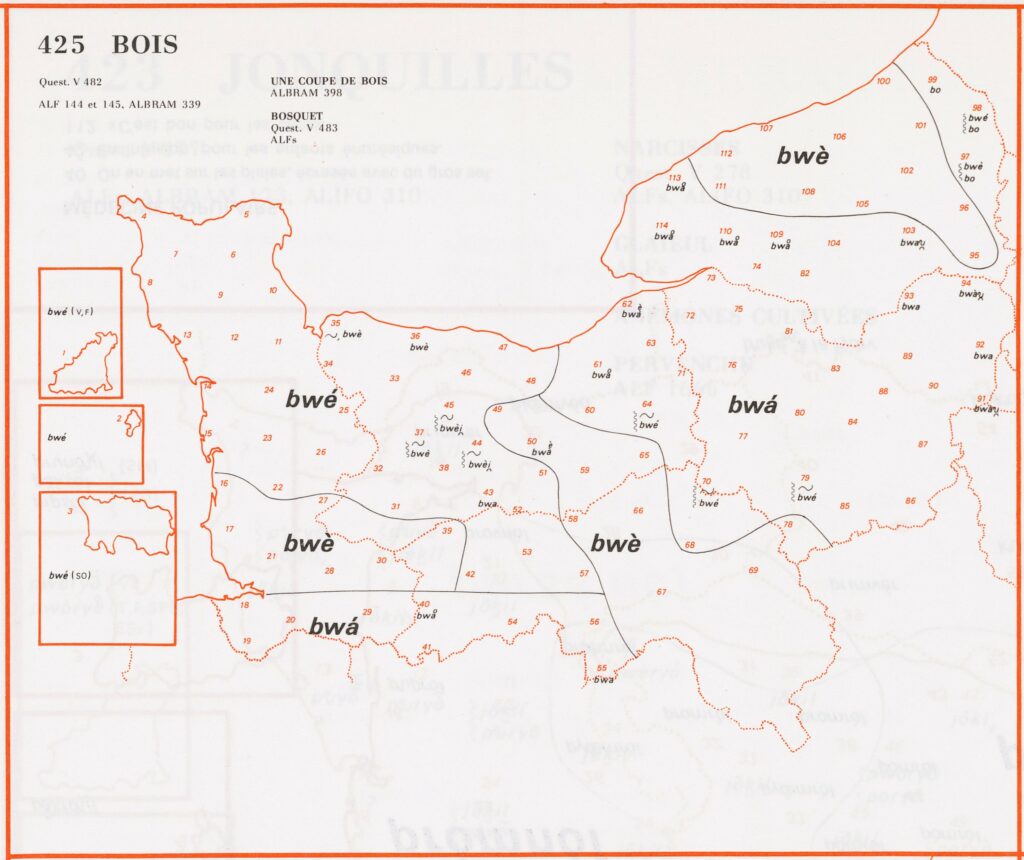 10- « Bois » Carte 10, numéro 425 dans l’ALN, « Bois ». Pour la réalisation de cette carte, nous avons favorisé l’aspect phonétique en définissant le code des couleurs selon la réalisation de la voyelle. 695 – Left Article précédent 9- « Lentilles d’eau » Article suivant 11- « Branche »