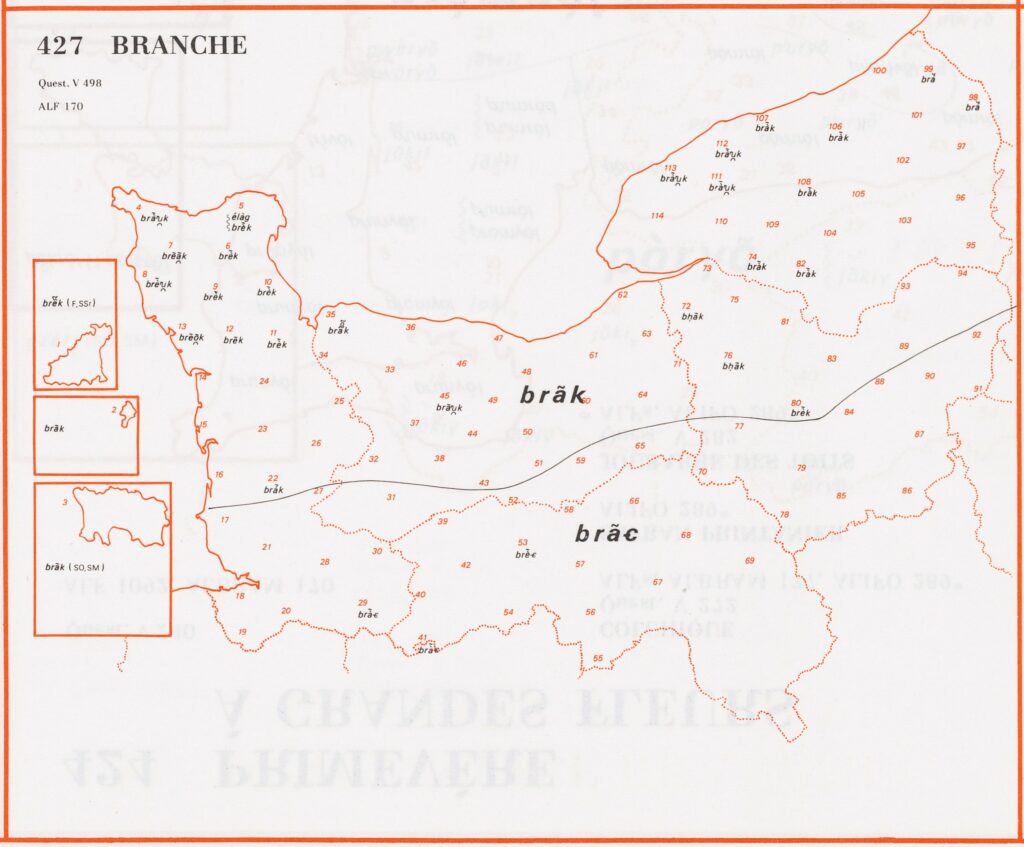 11- « Branche » Carte 11, numéro 427 dans l’ALN, « Branche ». Pour la réalisation de cette carte, nous avons favorisé l’aspect phonétique en définissant le code des couleurs selon que la consonne [k] suivie de [a] s’est palatalisée ou non. 695 – Left Article précédent 10- « Bois » Article suivant 12- « Souche »